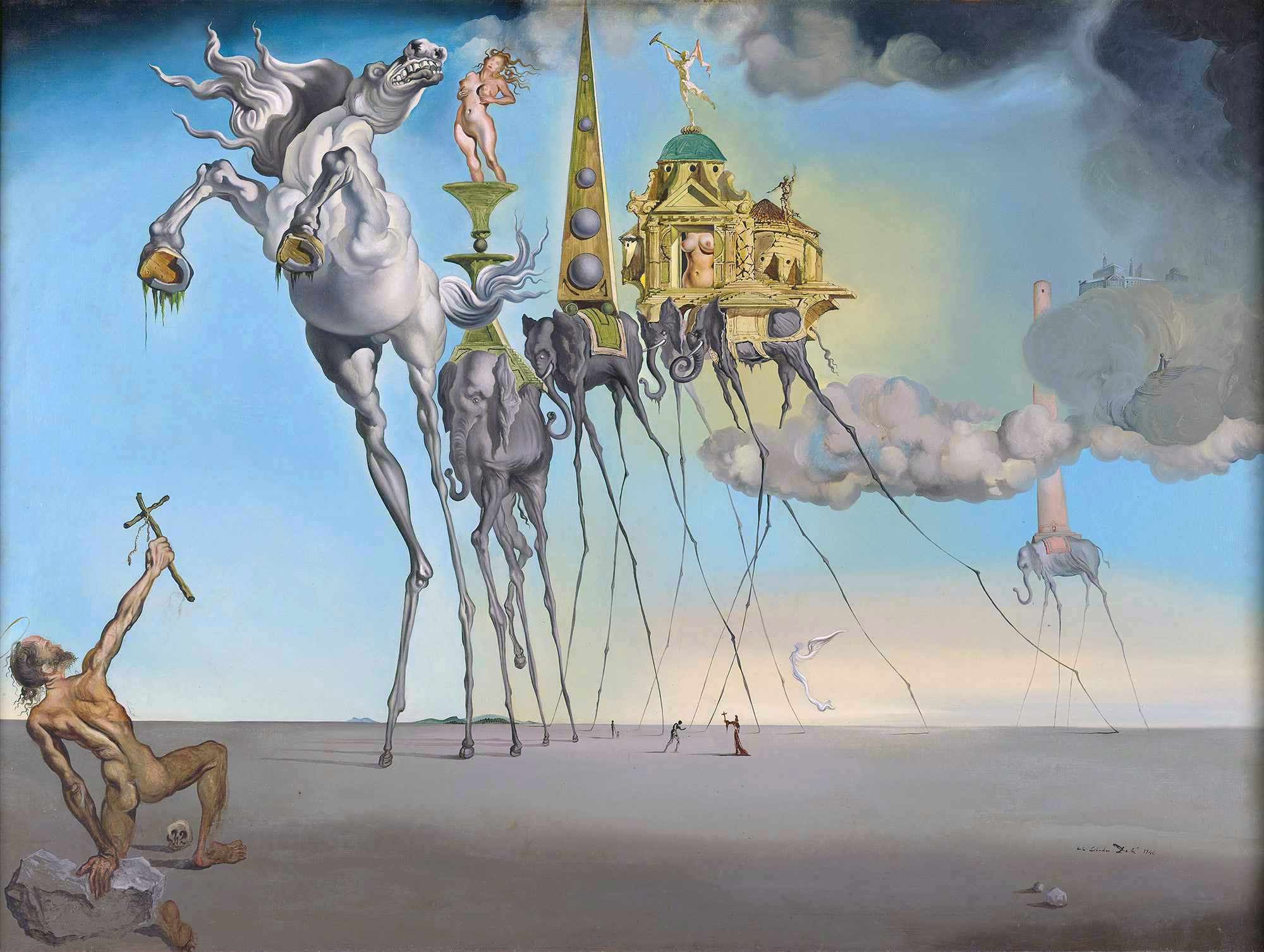 Salvador Dalí‘s painting “La Temptació de Sant Antoni” is clearly my favourite among all 20th century’s “Temptations”. He painted it in 1946, in response to a contest held by the David L. Loew – Albert Lewin film production company for a painting with this subject to be used in the film The Private Affairs of Bel Ami. This was the only art contest in which Dalí participated (and ultimately his painting was not chosen for the film; Max Ernst version was.)