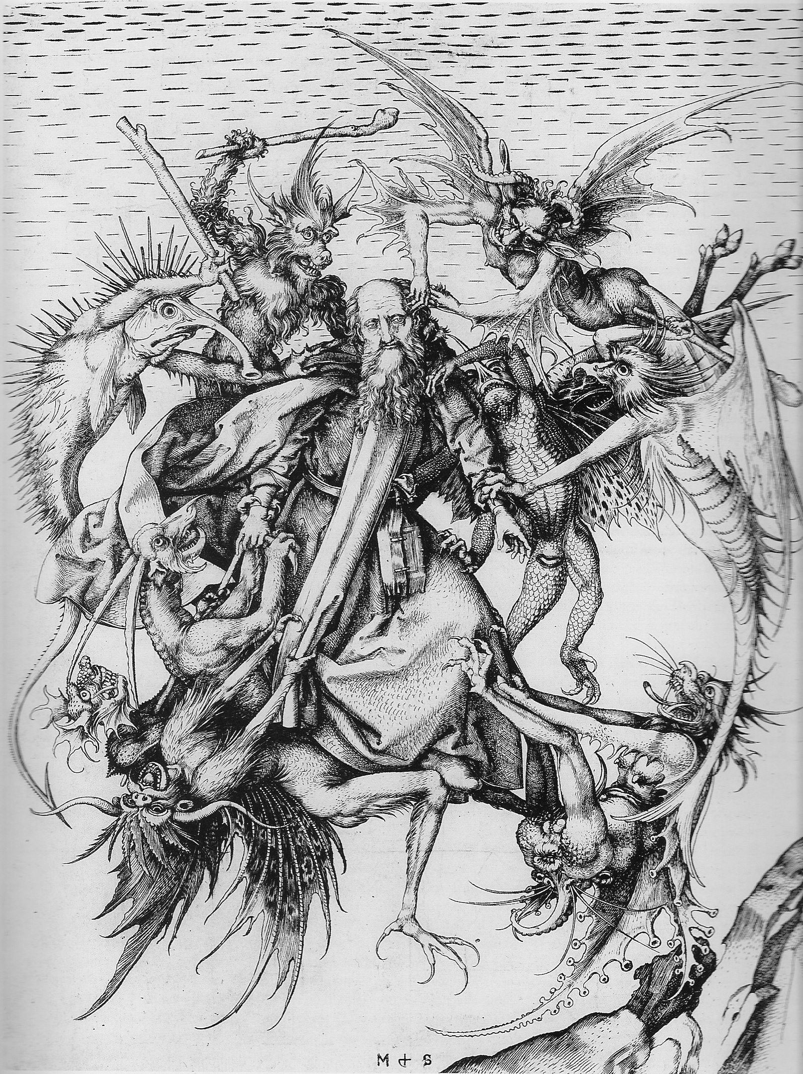 One of the best depictions of the ordeals that St. Anthony Abbot went through during his retirement in the desert is an engraving from the very late Middle Ages (ca. 1470-75) by the Alsatian Martin Schöngauer (ca. 1435/50-1491): “St. Antonius von Dämonen gepeinigt” (St. Anthony tormented by demons).