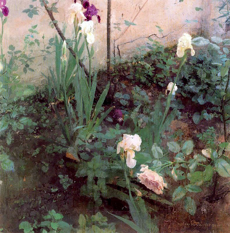 In a previous article on this artist I showed some of the superb paintings he made of the bathroom of his atelier (do not miss them!). Now I have selected a few fruits and flowers from his back yard. First of all, here down is the yard itself, as painted in 1969: