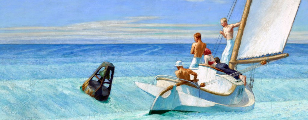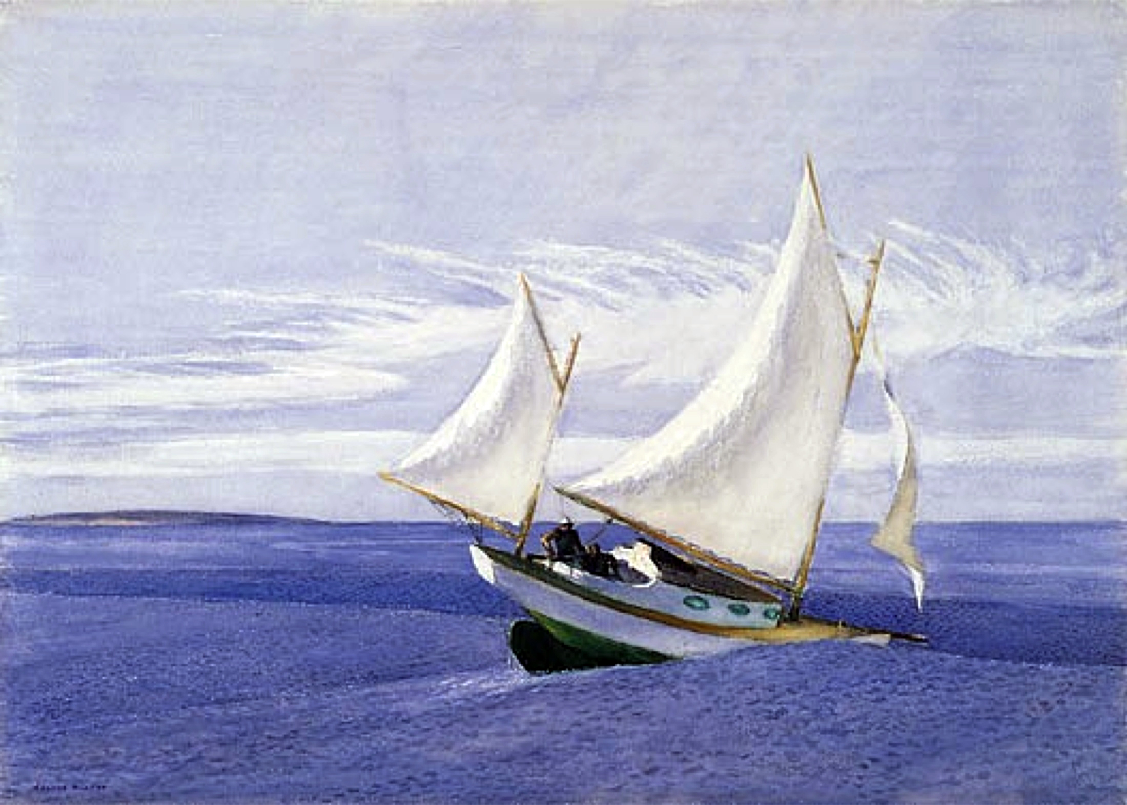It utilises horizontal strips of sky and sea –and here also land, parallel to them. Hopper’s only preparatory sketch for the oil reveals that he originally considered placing a standing figure near the mast rather than the two seated men seen in the final rendering. Some appreciate that the action appears rather frozen in time but I do not agree: I see the forward impulse and will say that Hopper effectively captured the push of the wind and great strength of the sea, with these two men’s momentary harmony with it.