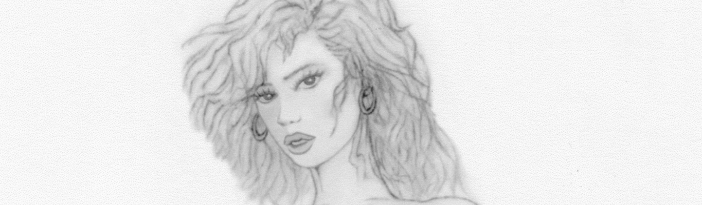 I begin with an old drawing (or a part of it). It is an idealized and much stylized self-portrait en femme: with full makeup, including false eyelashes and a choker. I did not give it a title, but I could name it this said way: Whisful self-portrait with makeup and a choker. I drew it in 1998 with Conté graphite pencils on paper –a sheet of 25.2 x 21.9 cm– and later on I scanned it at high definition. I added the earrings even later, extended the choker to a full short-sleeved turtle neck top, covered a thong (not seen here) with a pleated skirt and coloured it all with a fantastic set of Faber crayons I had just bought.