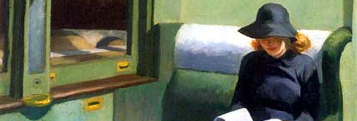 A train compartment, a lone woman, reading by a window, the sight of a bridge, a mixture of artificial light with that of a dusk, a lamp shut down; a complex geometric pattern of light and shadows… Pure Hopper, indeed; and a broad compendium of his favourite themes reunited in a single painting, effectively presented to suggest the viewer what he likes most to suggest: quietness, silence, introspection, solitude… along with the gradual, unexplainable feeling that something is about to happen soon.