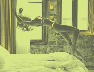 Pretty girl hopping, in four neon lights and plain bluish grey