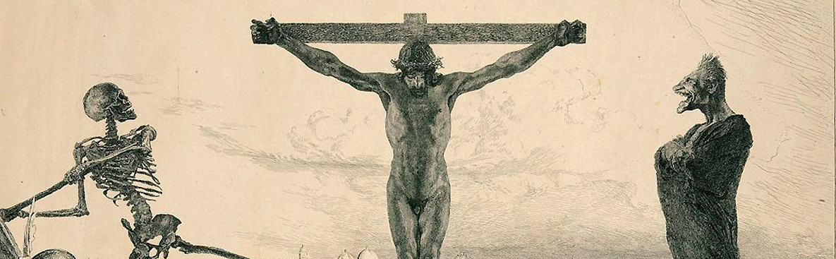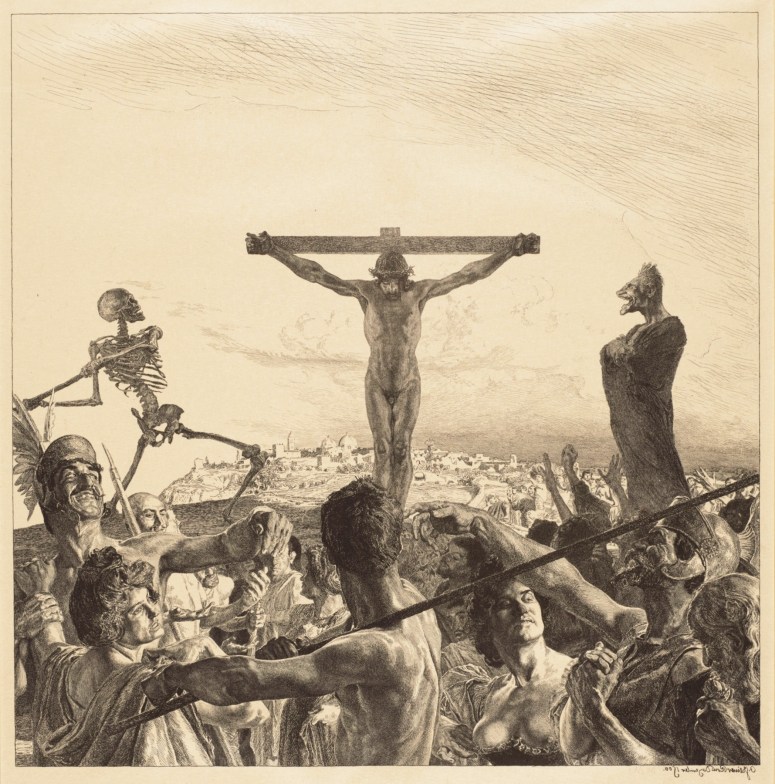 Also often he resorts to lurid scenes with ghastly figures, as in these pen-and-ink drawings below, both showing views of the Crucifixion. In the first one, which I like most, everything except Christ himself, and perhaps Death at his left, bewilders me. Maybe the laughing monster at Christ’s right represents the Devil, but the sneering soldiers holding a woman each (one of them looks quite like a transexual and very much like a prostitute) are weird and puzzling, even chilling: But maybe I am too impressible.